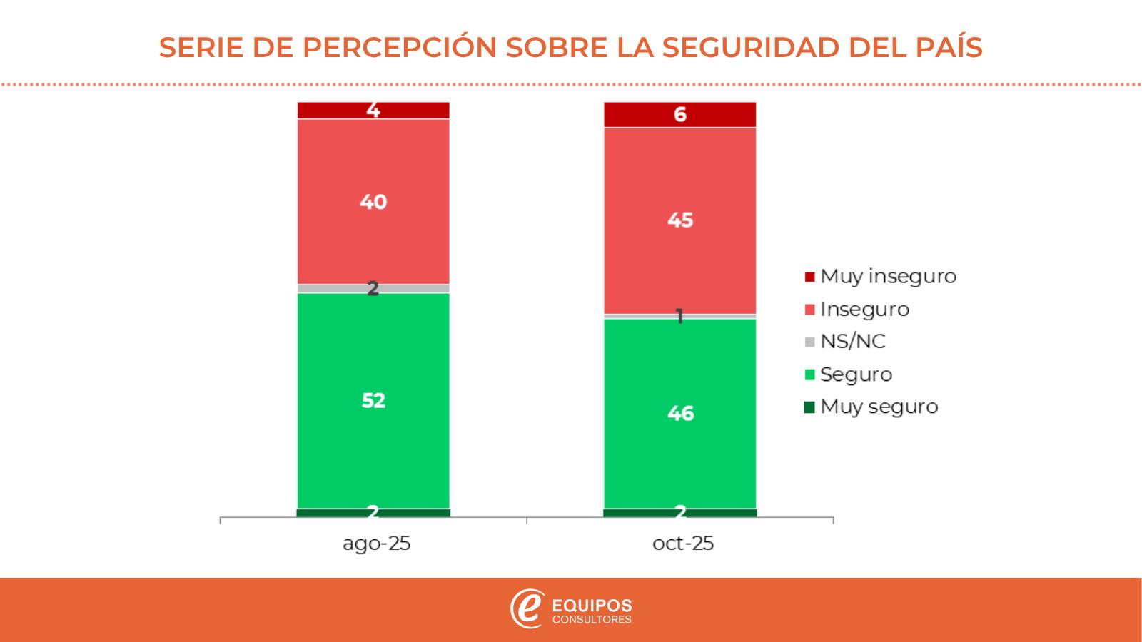 Evolución negativa en octubre. Los juicios sobre seguridad del país cambiaron respecto a agosto. Dos meses atrás también había opiniones divididas, pero de saldo claramente favorable: los que consideraban al país como un lugar seguro, superaban en 10 puntos a los que opinaban lo contrario. Luego de un mes de setiembre con una agenda intensa en materia de seguridad, se produce una evolución negativa en las percepciones, y la diferencia es de -3.