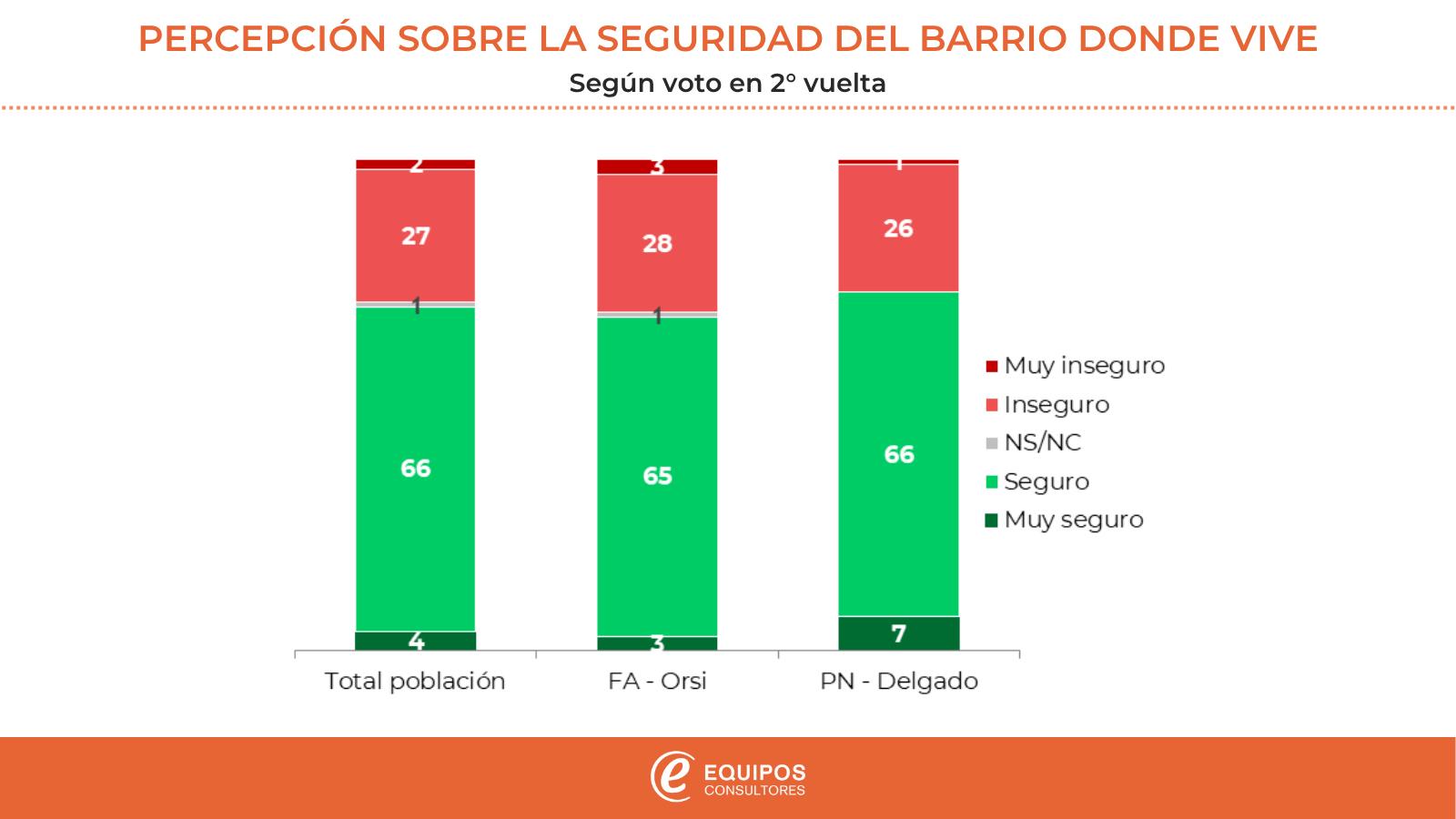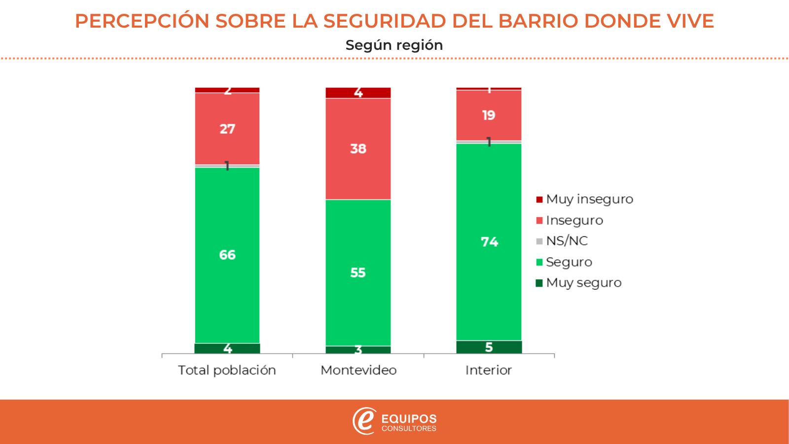 La gran mayoría percibe a su barrio como un lugar seguro. Contrastando con las percepciones sobre el país en su conjunto, siete de cada diez uruguayos perciben a su barrio como un lugar seguro. Este tipo de diferencias entre percepciones globales y locales es habitual en distintas temáticas (desde la limpieza de una ciudad respecto a su cuadra, hasta las percepciones sobre la economía individual y colectiva). Pueden estar asociadas a lo que se denomina “efecto de percepción local”, es decir, la tendencia de las personas a evaluar más positivamente el entorno cercano, y más críticamente el contexto más amplio.