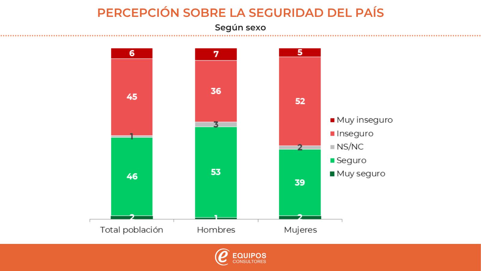 Variaciones por sexo. Como es habitual en estudios sobre seguridad pública, las percepciones varían de forma importante entre hombres y mujeres. Entre los varones predomina la sensación de seguridad del país (diferencia de +11 entre juicios positivos y negativos), mientras que entre las mujeres es más fuerte la percepción de inseguridad (diferencia de -16).