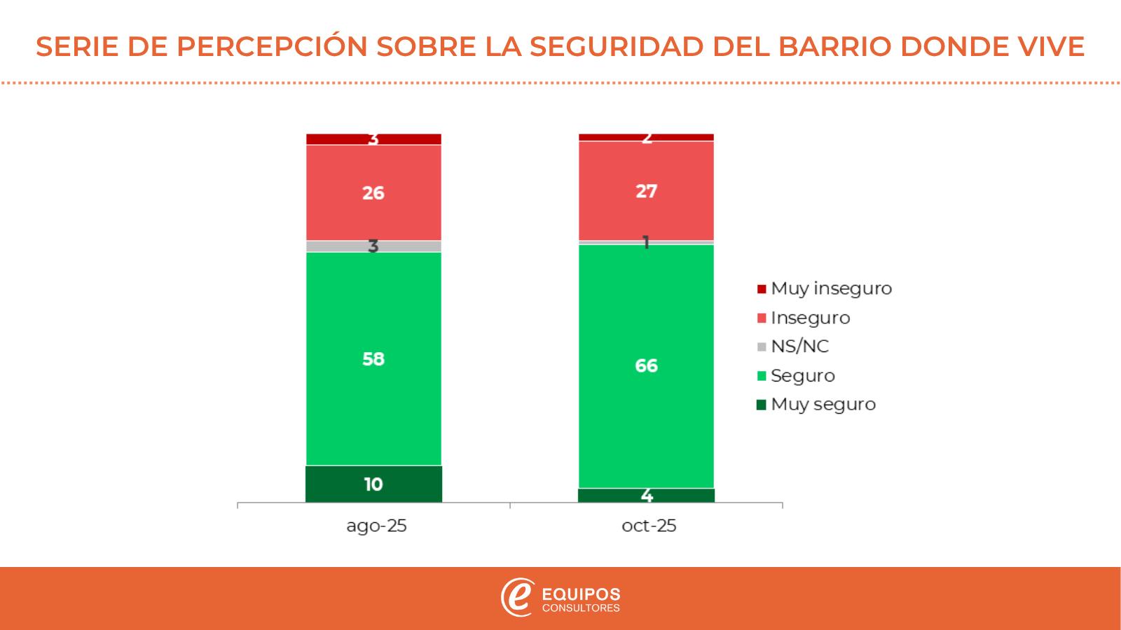 Las percepciones locales se mantuvieron estables en octubre. A diferencia de las percepciones sobre el país, que empeoraron en el último bimestre, las creencias sobre el barrio se mantuvieron en parámetros similares. La percepción de seguridad extrema (“muy seguro”) disminuye un poco, pero la suma de percepciones positivas (“seguro + muy seguro”) se mantiene estable, con leve crecimiento (dentro del error muestral).