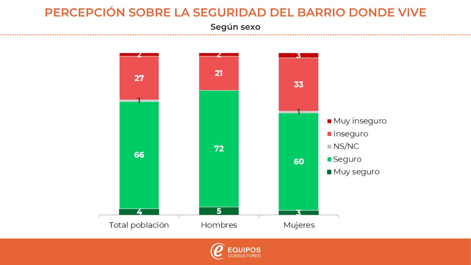 El sexo también es relevante en lo local. Tanto hombres como mujeres, mayoritariamente, perciben su barrio como seguro, pero lo hacen con énfasis muy diferentes. En forma similar a lo que se apreciaba con relación a la seguridad del país, la percepción de seguridad del barrio donde se vive es mucho mayor entre los hombres que entre las mujeres (14 puntos de diferencia entre ellos).