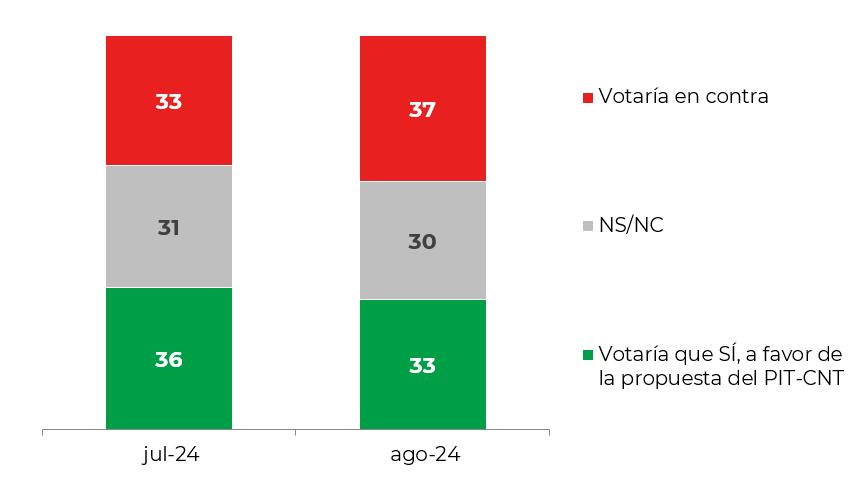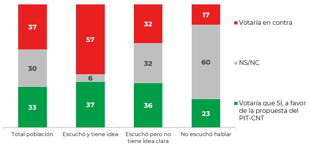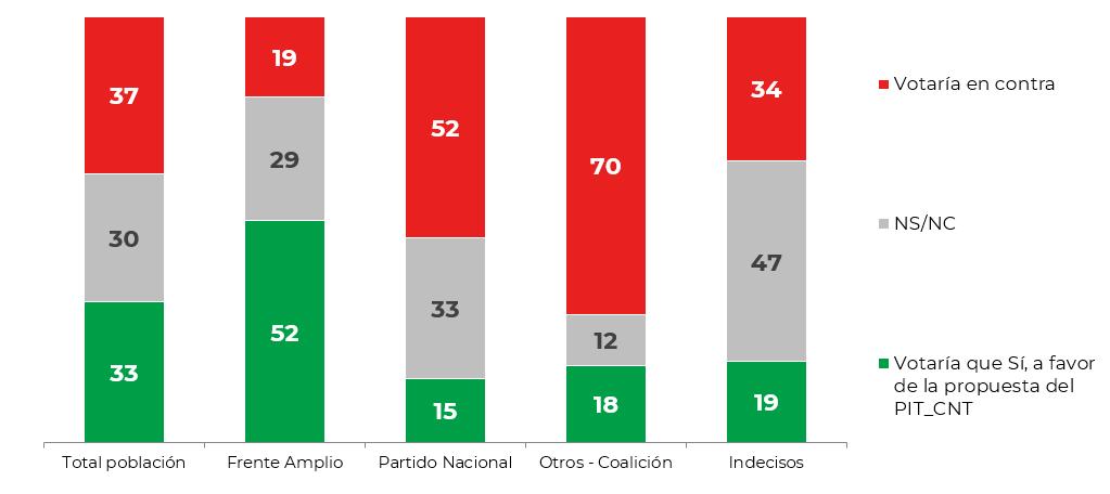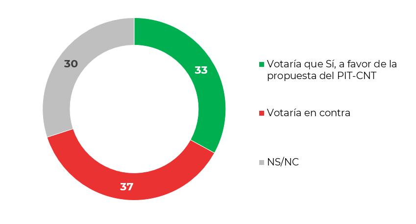 En este contexto de heterogeneidad informativa, también los apoyos y rechazos a esta iniciativa se dividen casi en tercios: 33% dice que votaría “a favor” de la propuesta del PIT-CNT, y 37% que votaría “en contra” (más allá de que técnicamente no existe un voto contrario porque no hay papeleta por el NO). En medio, otro tercio (30%) no tiene opinión conformada. Por tanto, si bien hoy la inclinación favorable al plebiscito está relativamente lejos de la mayoría requerida para su aprobación (50%), la alta indecisión genera incertidumbre respecto al resultado.