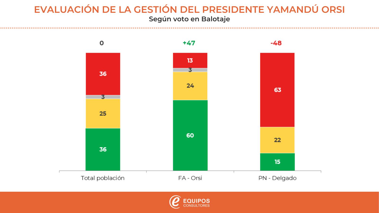La mayoría de los votantes frenteamplistas aprueban la forma en que Orsi se desempeña como presidente, y una minoría lo desaprueba. Por tanto, dentro de su propio electorado, Orsi mantiene un saldo neto ampliamente positivo (+47). Lo contrario ocurre entre los votantes de la oposición, donde casi dos de cada tres desaprueba el trabajo de Orsi, y el saldo neto en este caso es negativo en magnitud similar (-48).