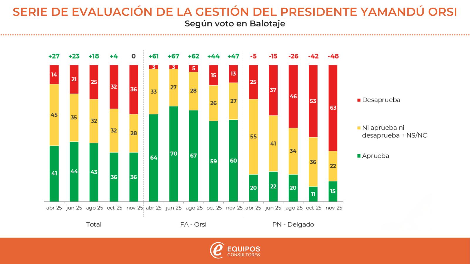 Al terminar noviembre, los juicios de los uruguayos sobre el desempeño del presidente Orsi están divididos, con balance equilibrado. La aprobación se ha mantenido alta entre los votantes frenteamplistas, pero las desaprobaciones han crecido fuertemente entre los votantes opositores. La imagen personal de Orsi se mantiene 10 puntos por encima de su evaluación de gestión.