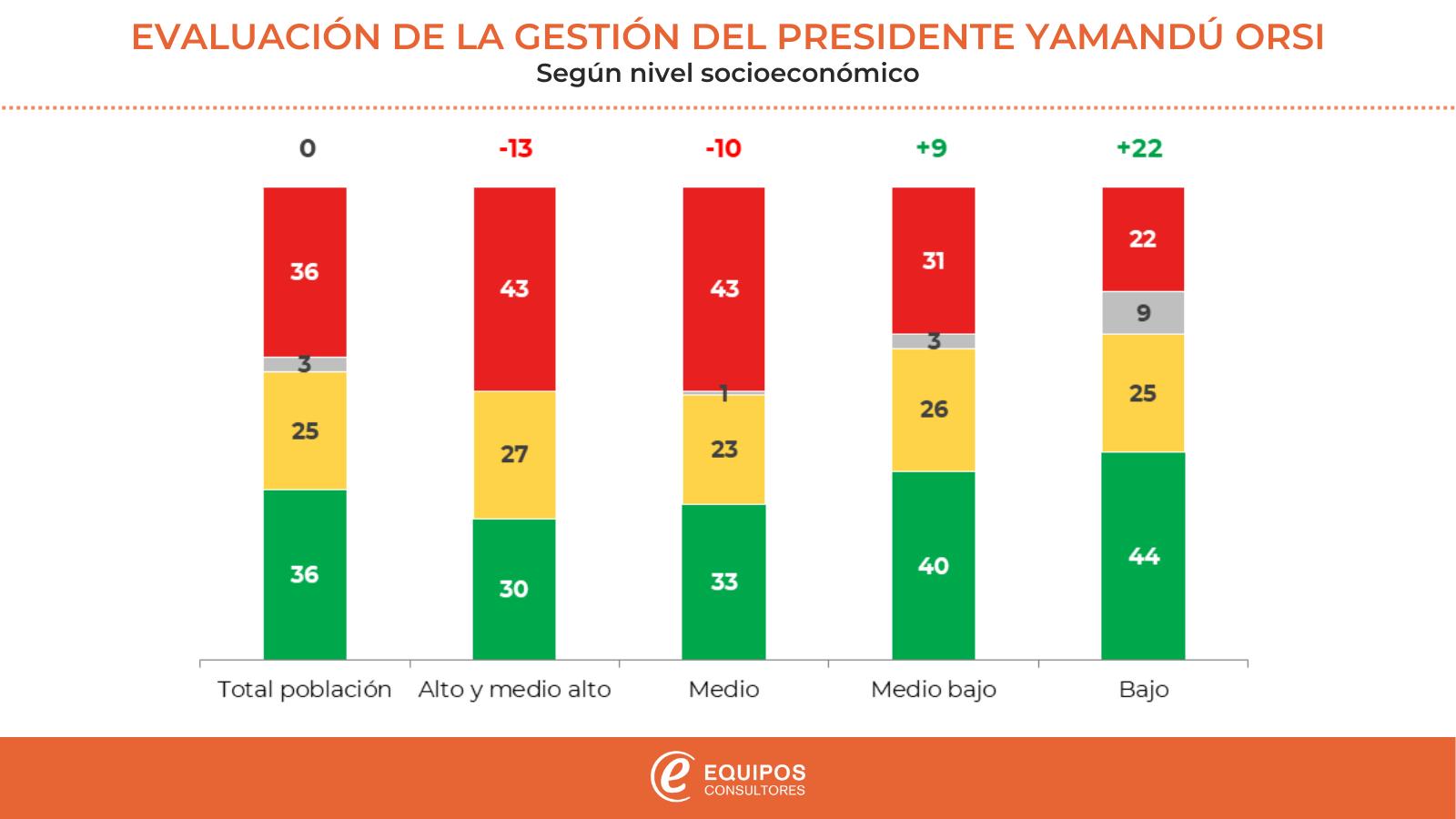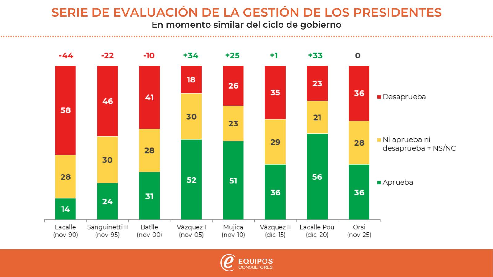 Al terminar el primer año de gobierno, solo tres presidentes (Vázquez, Mujica y Lacalle Pou) han logrado mantener amplios saldos positivos, mientras otros tres (Lacalle Herrera, Sanguinetti y Vázquez), tenían en el mismo punto del período saldos marcadamente negativos. Los datos actuales de Orsi, con un saldo neto equilibrado, son muy similares a los que se registraban en el segundo mandato de Vázquez (2015).