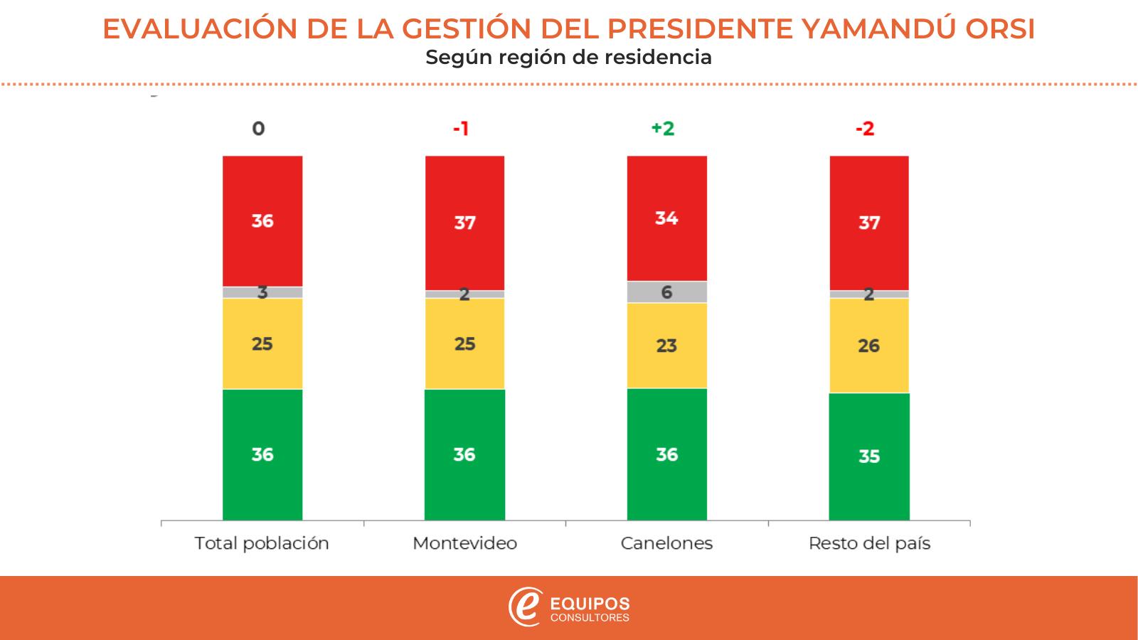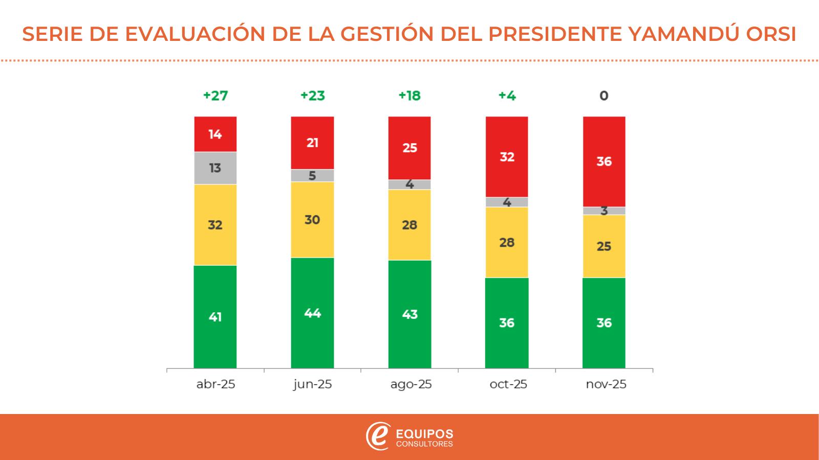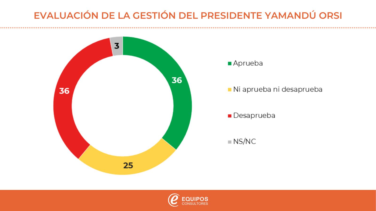 Algo más de un tercio de los uruguayos aprueba la forma en que Orsi se desempeña como presidente, y una proporción idéntica la desaprueba, llegando a esta altura del ciclo a un saldo neto absolutamente equilibrado (0).