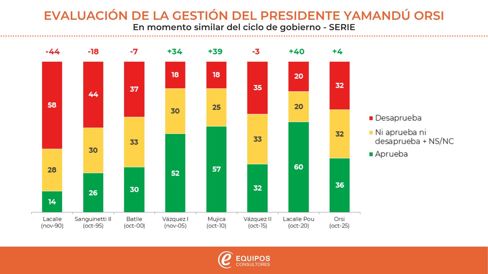 Zona media en la comparación histórica. En momentos similares del periodo de gobierno, los presidentes Vázquez (2005), Mujica (2010) y Lacalle Pou (2020) mantenían climas de opinión ampliamente favorables. En el otro extremo, Lacalle Herrera (1990) y Sanguinetti (1994) recibían niveles altos de desaprobación. En medio, Batlle (2000), Vázquez (2015) y actualmente Orsi (2025), se ubican en zona de relativo equilibrio entre aprobaciones y desaprobaciones, aunque Orsi, a diferencia de los otros dos, mantiene un saldo positivo.