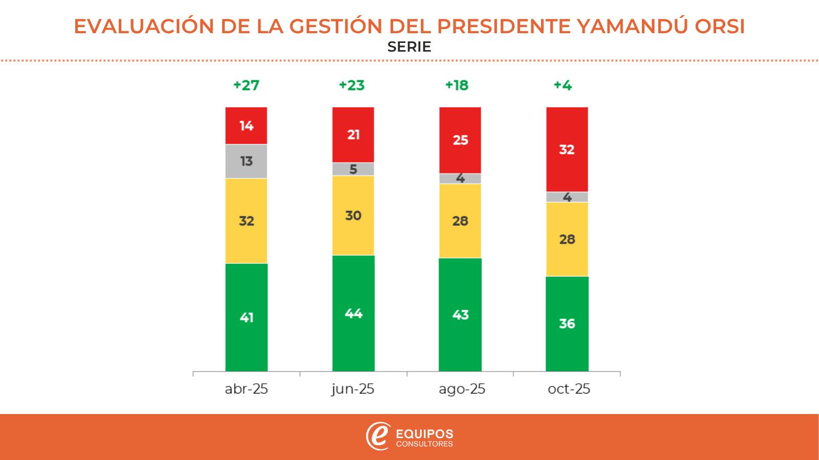 Los juicios sobre el desempeño del presidente Yamandú Orsi están divididos aproximadamente en tercios, con un moderado saldo positivo. Se agudizan las miradas críticas de los votantes de la oposición, pero también hay leve caída entre los votantes frenteamplistas. Los juicios son más favorables en los estratos medio bajos y bajos, y son más positivos en Canelones que en el resto del país.