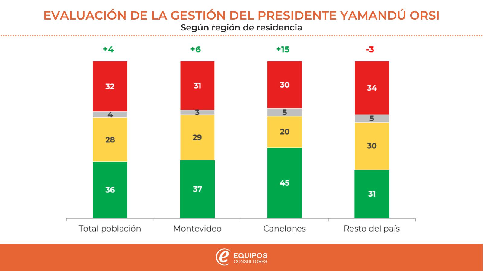 Canelones más favorable. En su departamento de origen el actual presidente mantiene niveles mayores de apoyo particularmente altos, superando a los que recibe en Montevideo (donde también tiene saldo positivo), y a los del resto del interior del país (donde su saldo neto es negativo).