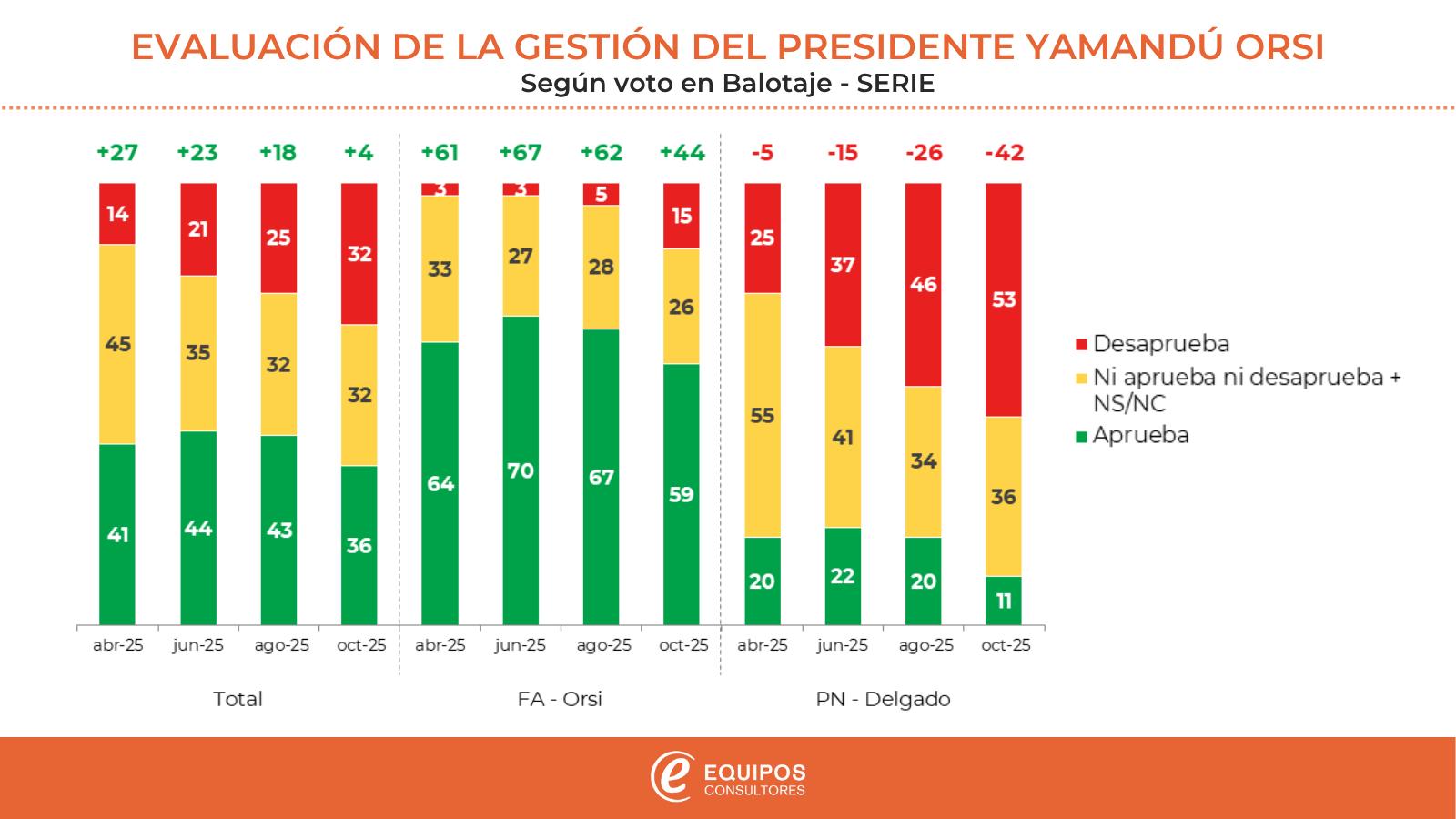 La oposición aumenta su desaprobación. El clivaje político discrimina fuertemente los juicios sobre el presidente. Orsi recibe amplia aprobación entre los votantes propios, y mayoritaria desaprobación entre los de oposición. La mirada del electorado opositor se ha vuelto gradualmente más crítica a medida que avanza el período, y explica la mayor parte de la caída de aprobación de Orsi en el mediano plazo. Sin embargo, en el corto plazo, también hay una caída en la aprobación dentro del electorado frenteamplista. Si bien la mayoría de los frenteamplistas aprueba al presidente, lo hacen en menor magnitud que las mediciones anteriores.