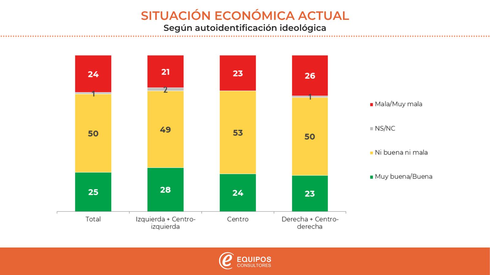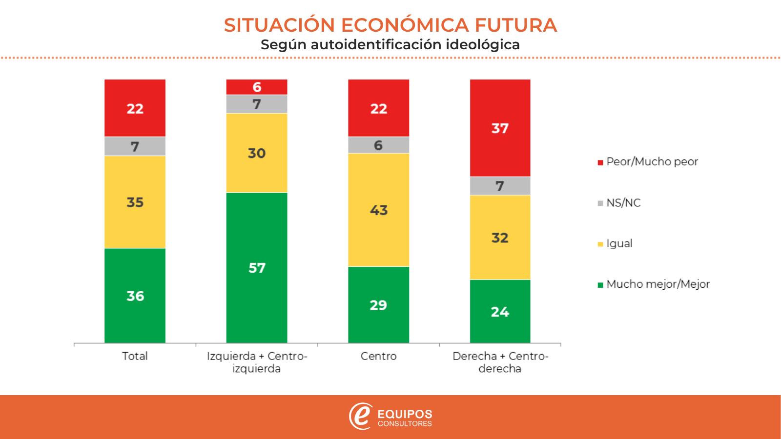 Los juicios sobre la economía actual son muy similares en todos los segmentos ideológicos. Sin embargo, las expectativas futuras sí varían ideológicamente. Entre los votantes de izquierda predomina el optimismo, mientras que entre los votantes de derecha hay opiniones divididas (de saldo negativo).