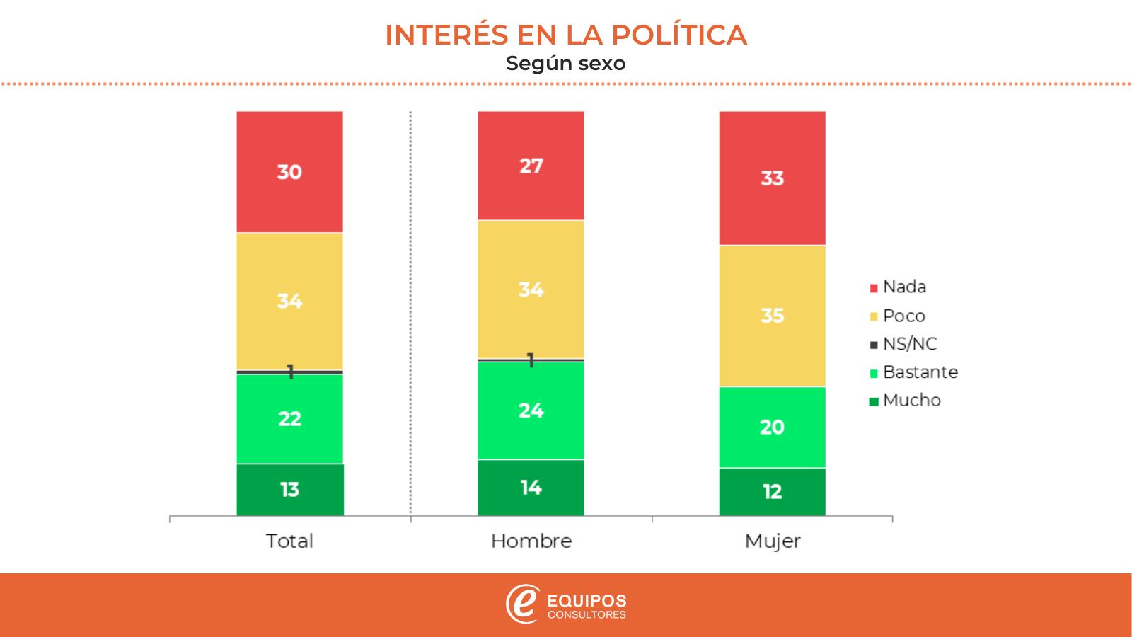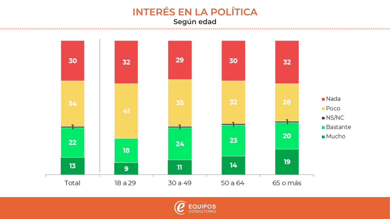 En términos etarios, el interés mayor por la política (sumando “mucho” + “bastante”) aumenta de 27% entre los jóvenes a 39% entre los de mayor edad. Sin embargo, si se mira el otro extremo (el que asume que la política no interesa “nada”, no se observan diferencias significativas. Alrededor de un tercio, en todas las franjas de edad, parece desinteresado por completo por la política.