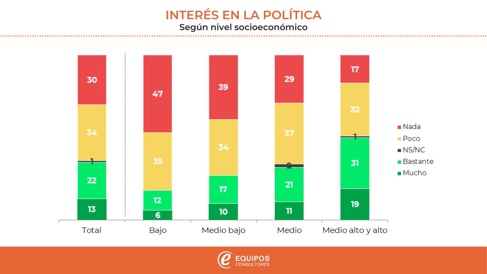 El efecto es mayor aun cuando se analiza el nivel socioeconómico. Aquí no se puede hablar de matices, sino de aproximaciones nítidamente diferentes. El interés en la política aumenta directamente asociado a la estratificación social, con extremos contrastantes. Entre los estratos medio altos y altos el interés (“mucho” + “bastante”) llega al 50% y el desinterés absoluto es de 17%. Por el contrario, entre los individuos de estratos bajos, la situación es prácticamente inversa: 18% de interés contra 47% de desinterés total. El contraste es notable.