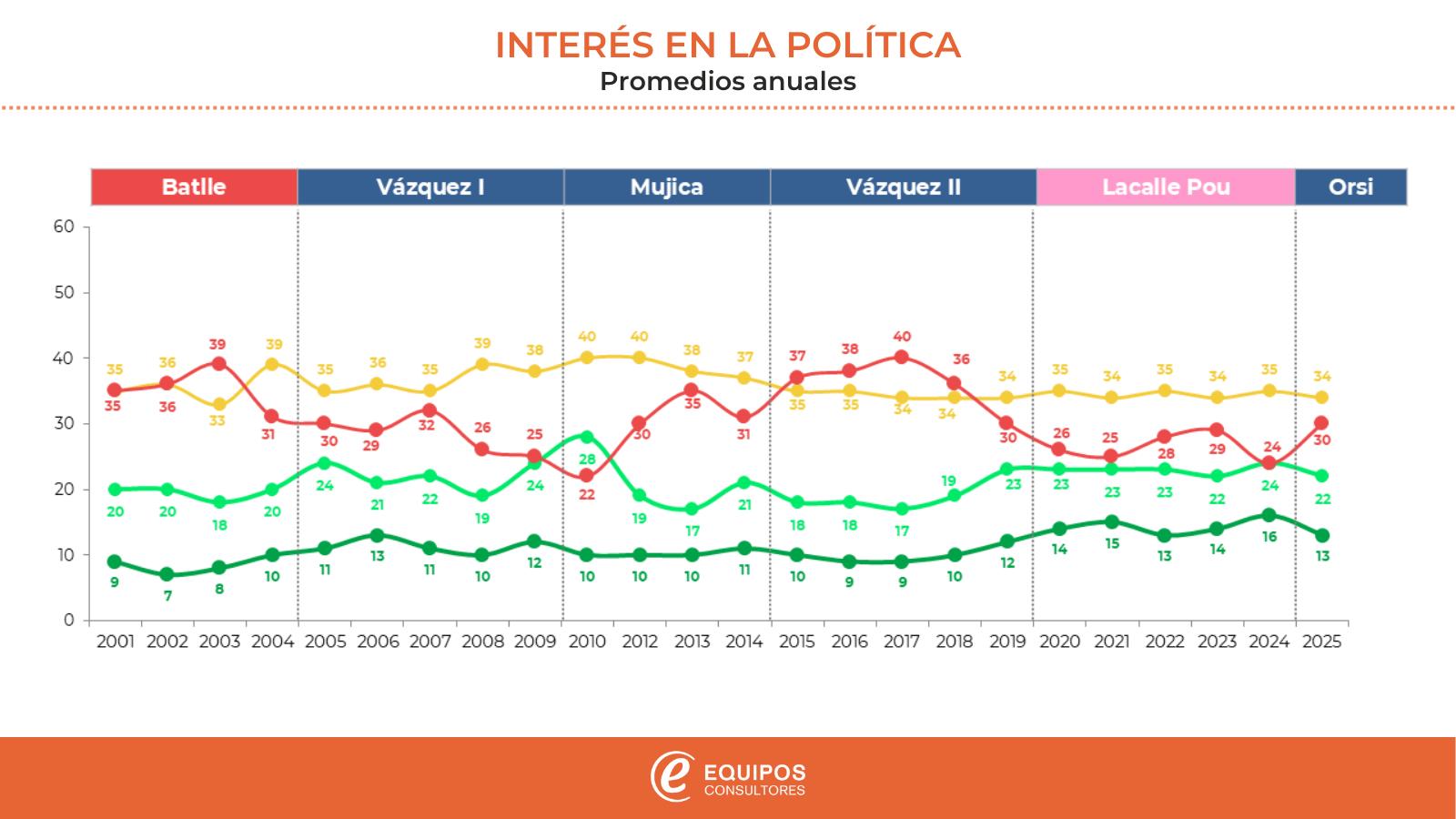 En el corto plazo, efectivamente durante 2025, el interés en la política cayó comparado con 2024 y también con los años previos. Pero es necesario tener en cuenta que este último período fue uno de interés excepcionalmente alto respecto al pasado. A partir de 2020 la pandemia de Covid-19 generó un contexto en el cual la política resultó más atractiva para muchos ciudadanos. Y 2024 particularmente, año electoral con plebiscito de la seguridad social incluido, fue el año de mayor interés de todo el registro histórico del siglo (con 40% de interés “mucho” + “bastante”). Por tanto, caída efectiva respecto a los años anteriores sí, pero con la advertencia de que se venía de años muy buenos.